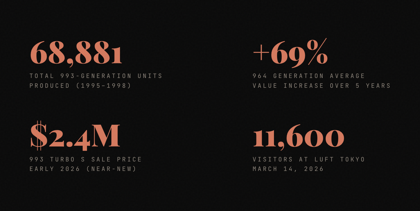 Air cooled Porsches entered its golden era. Luft Tokyo 2026 shut down a Ginza expressway and proved what the numbers already suggested - fifty years of analog Porsche engineering have crossed the threshold from collector hobby into a self-contained, culturally fortified asset class. Here's Coolture’s thesis.